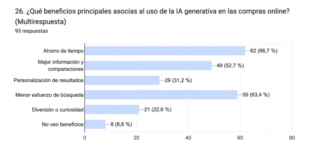 1. Alto nivel de adopción La mayoría de los encuestados utiliza herramientas de IA en alguna fase de su compra online. ChatGPT y Google IA son las más mencionadas.