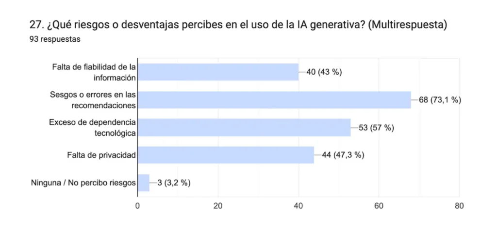 3. Utilidad alta, confianza moderada • Los usuarios consideran la IA muy útil para ahorrar tiempo y organizar información. • Aun así, muestran una confianza moderada y suelen contrastar la información con otras fuentes.